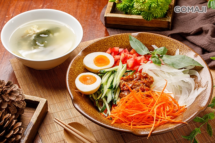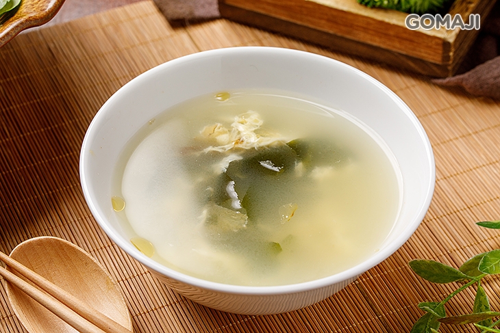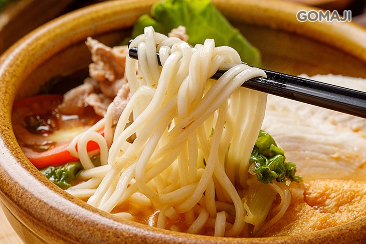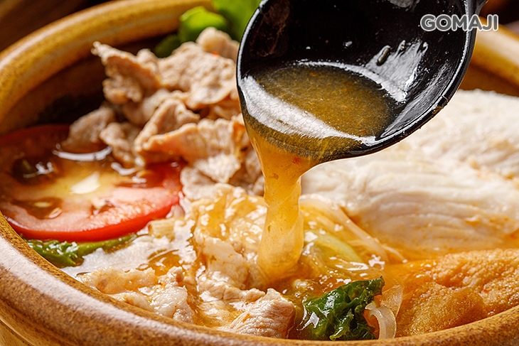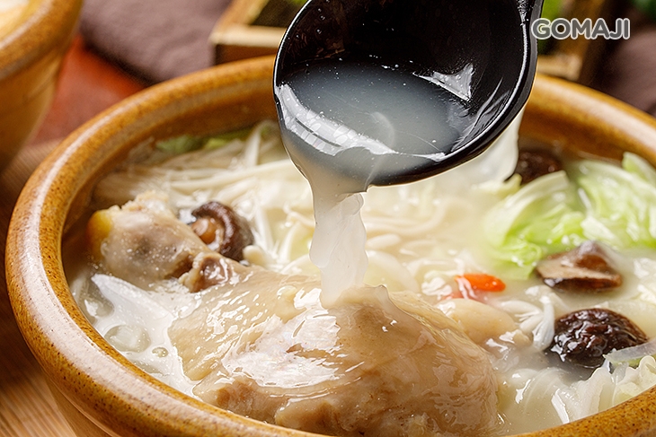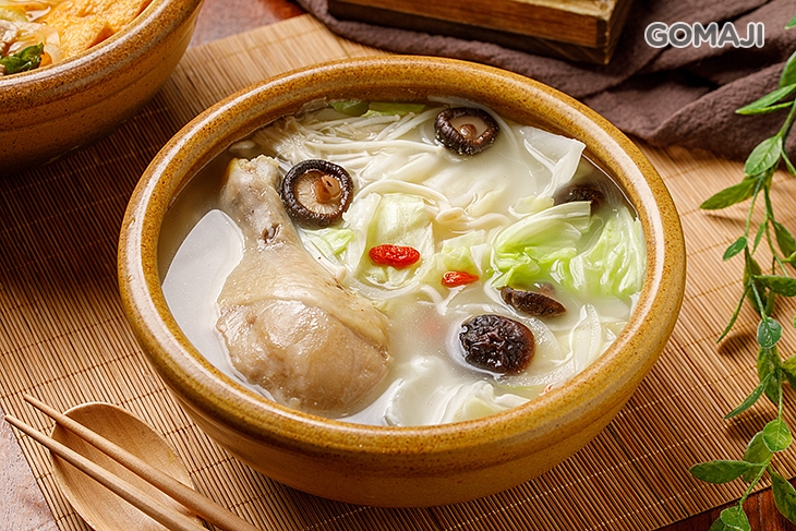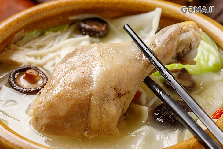 由雞肉、雞油、豬肉、香菇粉、薑汁、食鹽、蒜、香料烹調而成的湯底,口感如日式雞白湯,淡雅中帶點清香、不帶油膩,再搭配獨家烹調的雞腿肉、金針菇與香菇,湯醇肉嫩,不論四季都適合享用。