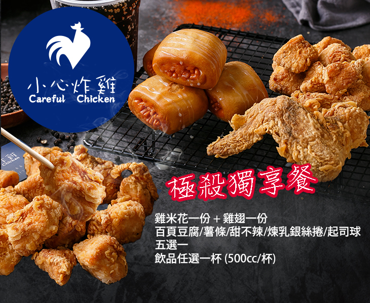 炸雞新勢力,強勢來襲!金黃香酥的炸雞以及琳瑯滿目的炸物甜點,是您下班或放課後的最佳陪伴!無論是朋友相聚,或是在家追劇,都是最好的配菜!小心炸雞不僅將炸雞料理得皮脆多汁,更是擁有豐富的炸物點心,樣樣都是香脆又可口!店裡入料的食材,都經由老闆嚴格把關,不只要用美味的食物陪伴您,更是要用安全、衛生的美味撫卹您一整天的辛勞。小心炸雞用心炸出一道道令人回味無窮的銷魂美味,嚐過一次便惹人上癮,真的是太好吃了!要小心!