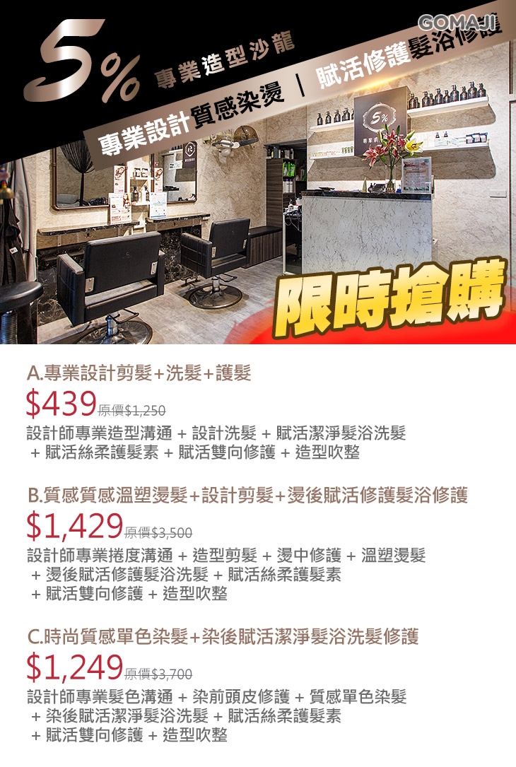 【5%專業造型沙龍】感謝麻吉們熱烈搶購,已全數賣光光。