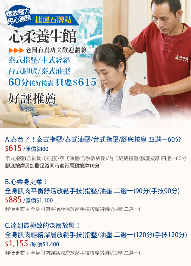 A.泰台了!泰式指壓/泰式油壓/台式指壓/腳底按摩 四選一60分 / B.心柔身更柔!全身肌肉平衡舒活放鬆手技(指壓/油壓 二選一)90分(手技90分) / C.達到最極致的深層放鬆!全身肌肉經絡深層放鬆手技(指壓/油壓 二選一)120分(手技120分)