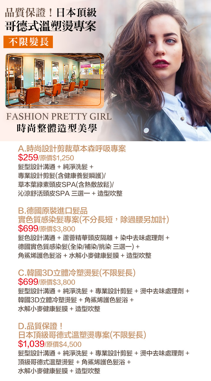 A.時尚設計剪裁草本森呼吸專案 / B.德國原裝進口髮品 實色質感染髮專案(不分長短,除過腰另加計) / C.韓國3D立體冷塑燙髮(不限髮長) / D.品質保證!日本頂級哥德式溫塑燙專案(不限髮長)