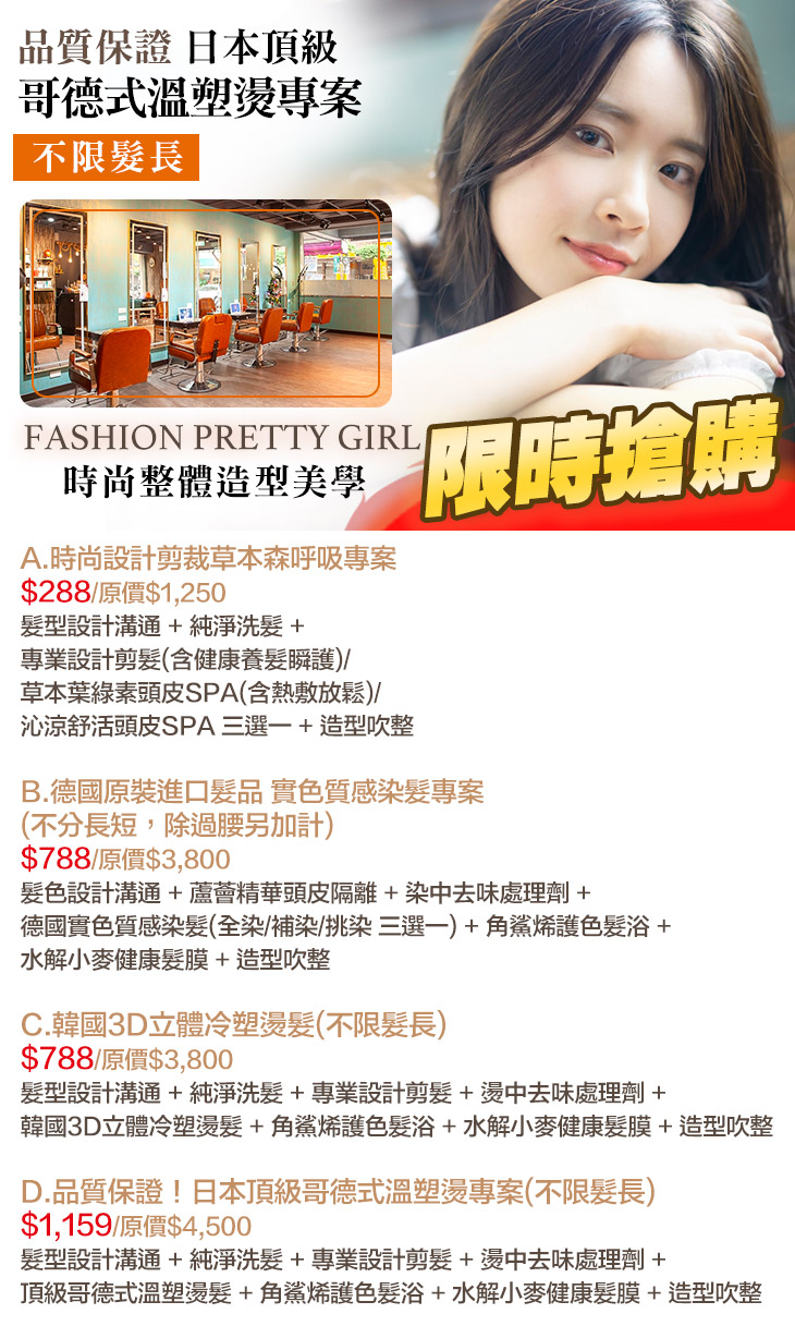 A.時尚設計剪裁草本森呼吸專案 / B.德國原裝進口髮品 實色質感染髮專案(不分長短,除過腰另加計) / C.韓國3D立體冷塑燙髮(不限髮長) / D.品質保證!日本頂級哥德式溫塑燙專案(不限髮長)