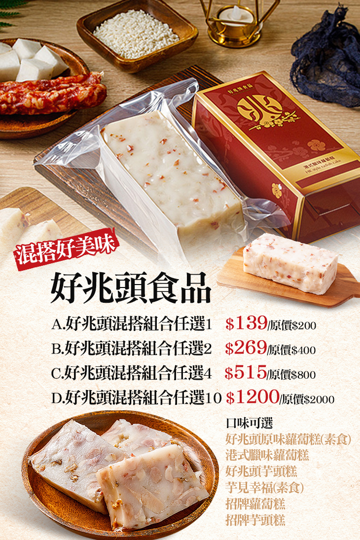 〈好兆頭原味蘿蔔糕(素食)/港式臘味蘿蔔糕/好兆頭芋頭糕/芋見幸福(素食)/招牌蘿蔔糕/招牌芋頭糕 任選10〉