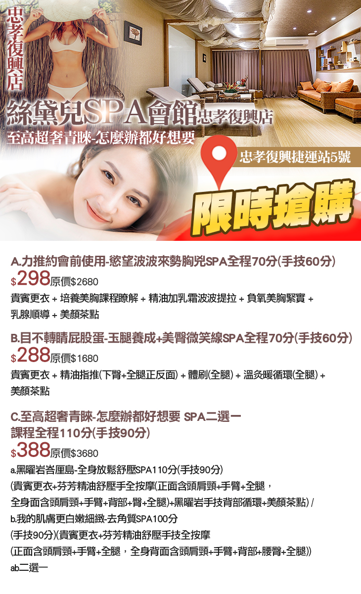 【絲黛兒SPA會館(忠孝復興店)】感謝麻吉們熱烈搶購,已全數賣光光。