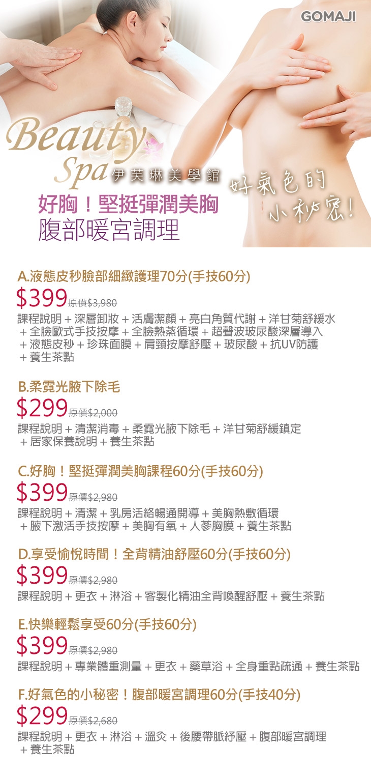A.液態皮秒臉部細緻護理70分(手技60分) / B.柔霓光腋下除毛 / C.好胸!堅挺彈潤美胸課程60分(手技60分) / D.享受愉悅時間!全背精油舒壓60分(手技60分) / E.快樂輕鬆享受60分(手技60分) / F.好氣色的小秘密!腹部暖宮調理60分(手技40分)
