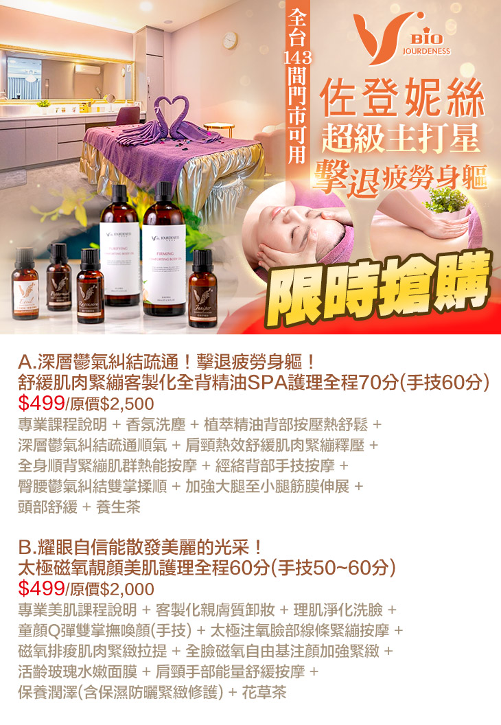 A.深層鬱氣糾結疏通!擊退疲勞身軀!舒緩肌肉緊繃客製化全背精油SPA護理全程70分(手技60分) / B.耀眼自信能散發美麗的光采!太極磁氧靚顏美肌護理全程60分(手技50~60分)