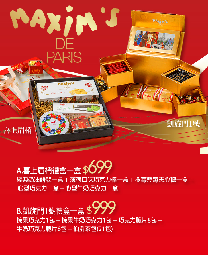 Maxim's 自從1893年在巴黎協和廣場旁設立了第一家餐廳以來,從當年只是一間小酒館,到90年代已成為社交名流流連聚集的場所,就連著名超現實主義畫家-薩爾瓦多‧達利都曾是座上佳賓。1981年,義大利著名服裝設計Pierre Cardin 皮爾·卡登先生Vaudable家族接下Maxim's餐廳,以他卓越的藝術成就及經營品牌的經驗替Maxim's 注入了新的靈魂。Maxim's 搖身成為全球時尚卻又同時擁有古典、優雅、浪漫品味的用餐地點,品牌擁有超過800種不同系列商品在全球販售,從巧克力、咖啡、茶葉、餅乾、香檳到禮盒等,從包裝視覺到甜品本身都帶給賓客不同層次的驚喜感。