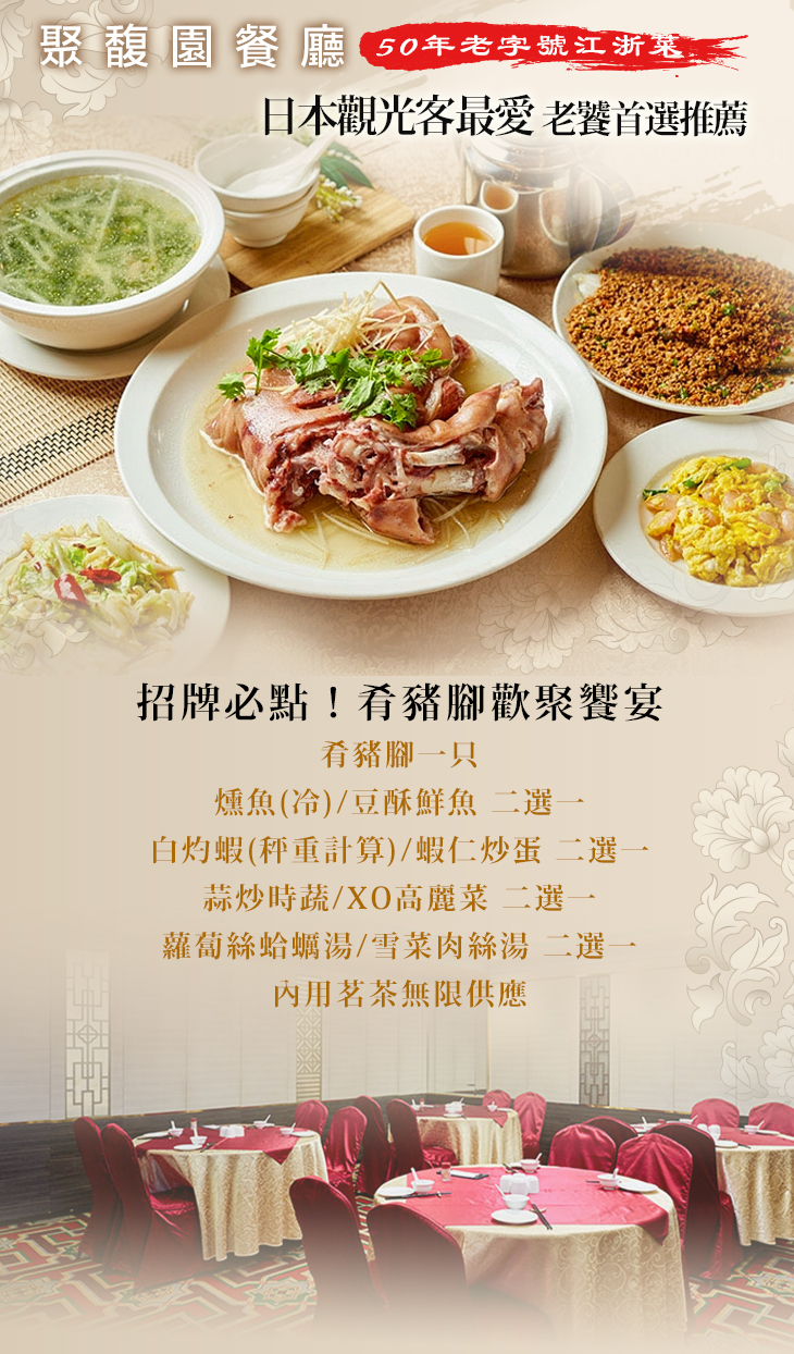 肴豬腳一只 + 燻魚(冷)/豆酥鮮魚 二選一 + 白灼蝦(秤重計算)/蝦仁炒蛋 二選一 + 蒜炒時蔬/XO高麗菜 二選一 + 蘿蔔絲蛤蠣湯/雪菜肉絲湯 二選一 + 內用茗茶無限供應