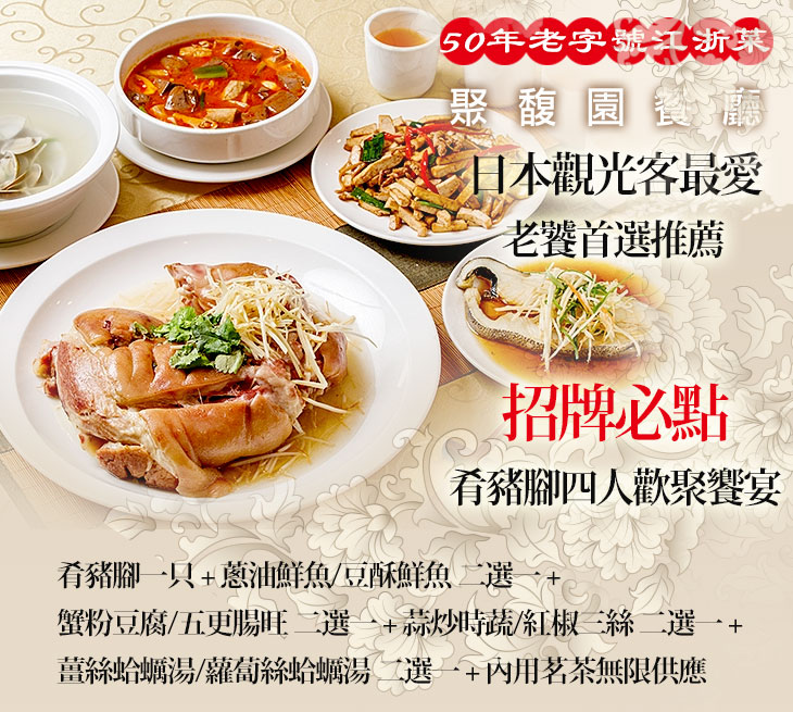 〈肴豬腳一只 + 蔥油鮮魚/豆酥鮮魚 二選一 + 蟹粉豆腐/五更腸旺 二選一 + 蒜炒時蔬/紅椒三絲 二選一 + 薑絲蛤蠣湯/蘿蔔絲蛤蠣湯 二選一 + 內用茗茶無限供應〉