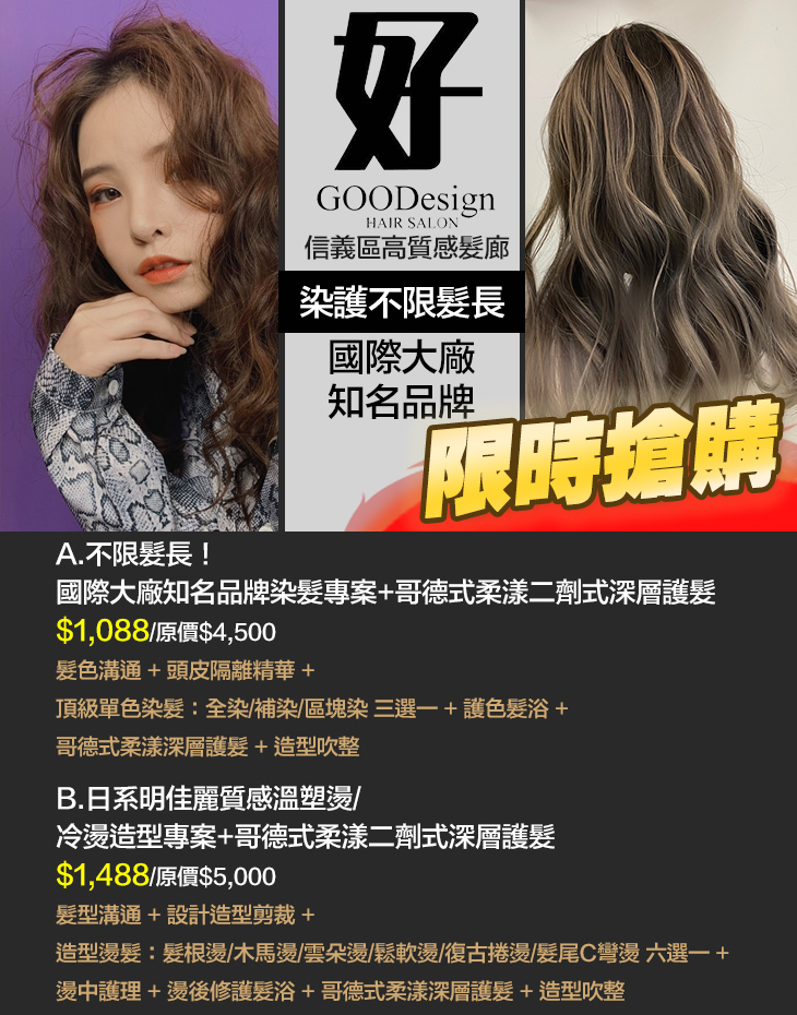 A.不限髮長!國際大廠知名品牌染髮專案+哥德式柔漾二劑式深層護髮 / B.日系明佳麗質感溫塑燙/冷燙造型專案+哥德式柔漾二劑式深層護髮