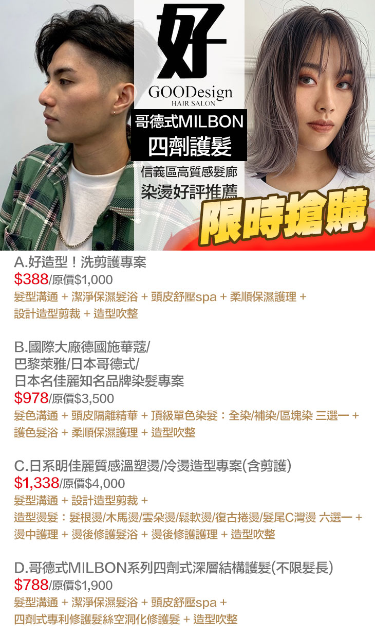 A.好造型!洗剪護專案 / B.國際大廠德國施華蔻/巴黎萊雅/日本哥德式/日本名佳麗知名品牌染髮專案 / C.日系明佳麗質感溫塑燙/冷燙造型專案(含剪護) / D.哥德式MILBON系列四劑式深層結構護髮(不限髮長)