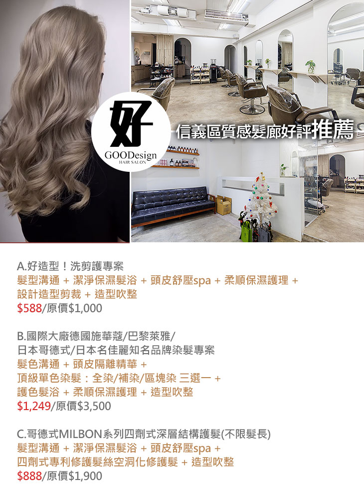 A.好造型!洗剪護專案 / B.國際大廠德國施華蔻/巴黎萊雅/日本哥德式/日本名佳麗知名品牌染髮專案 / C.哥德式MILBON系列四劑式深層結構護髮(不限髮長)