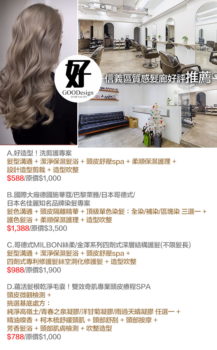 A.好造型!洗剪護專案 / B.國際大廠德國施華蔻/巴黎萊雅/日本哥德式/日本名佳麗知名品牌染髮專案 / C.哥德式MILBON絲柔/金澤系列四劑式深層結構護髮(不限髮長) / D.蘊活髮根乾淨毛囊!雙效奇肌專業頭皮療程SPA