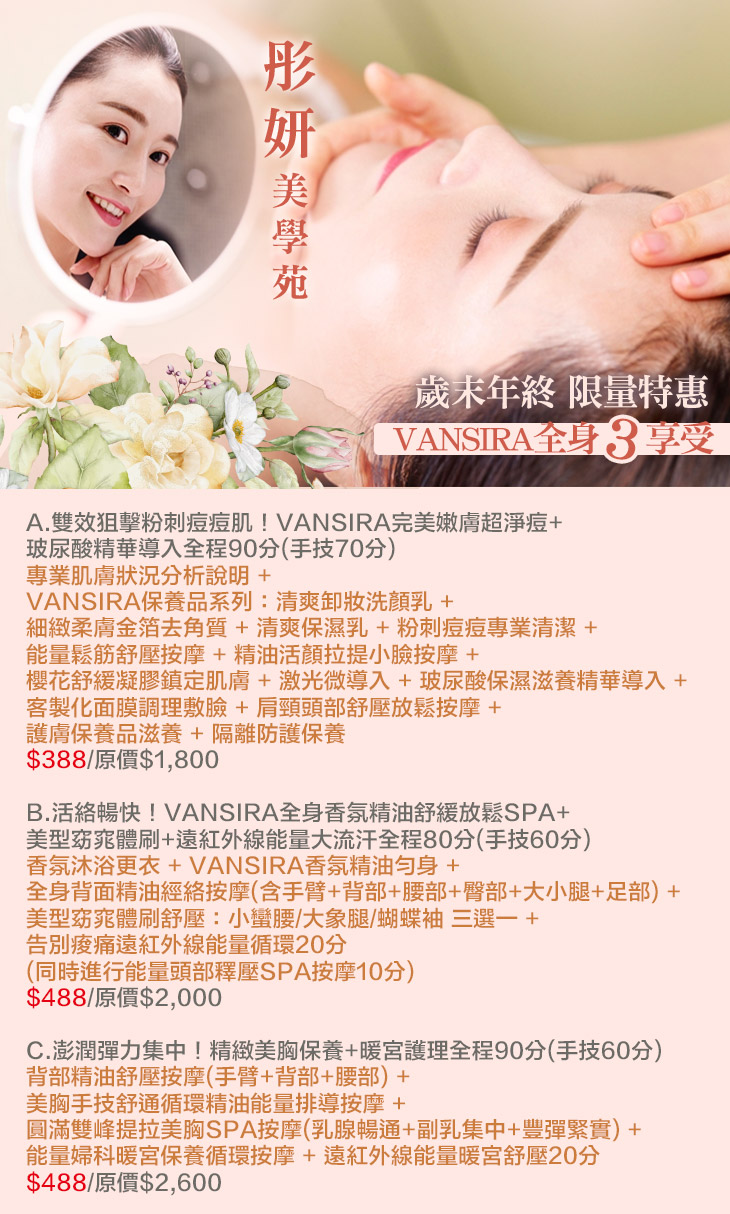 A.雙效狙擊粉刺痘痘肌!VANSIRA完美嫩膚超淨痘+玻尿酸精華導入全程90分(手技70分) / B.活絡暢快!VANSIRA全身香氛精油舒緩放鬆SPA+美型窈窕體刷+遠紅外線能量大流汗全程80分(手技60分) / C.澎潤彈力集中!精緻美胸保養+暖宮護理全程90分(手技60分)