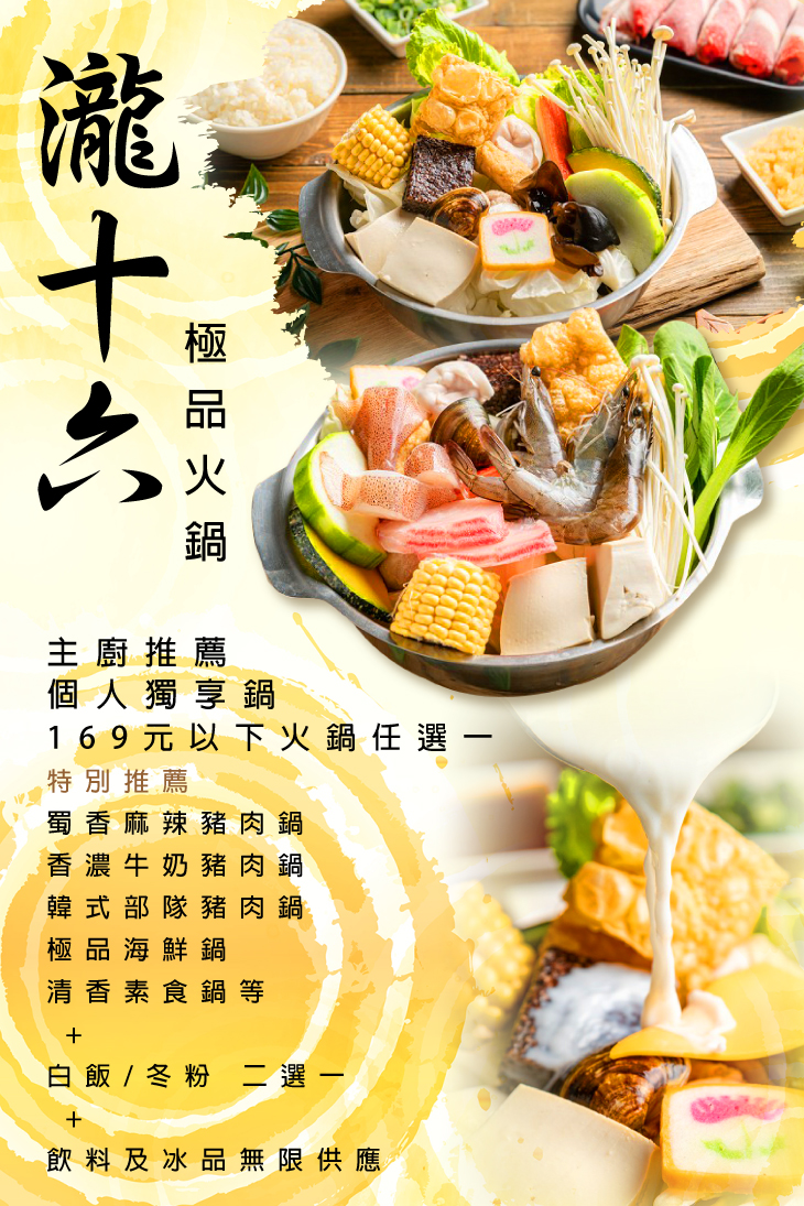 169元以下火鍋任選一(特別推薦:蜀香麻辣豬肉鍋、香濃牛奶豬肉鍋、韓式部隊豬肉鍋、極品海鮮鍋、清香素食鍋等) + 白飯/冬粉 二選一 + 飲料及冰品無限供應
