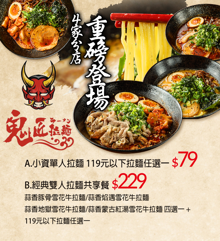 〈蒜香豚骨雪花牛拉麵/蒜香焰遇雪花牛拉麵/蒜香地獄雪花牛拉麵/蒜香蒙古紅湯雪花牛拉麵 四選一 + 119元以下拉麵任選一〉