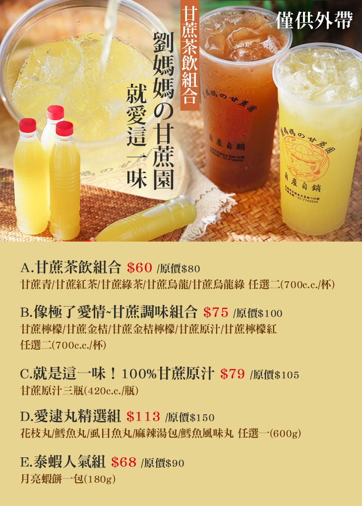 【劉媽媽の甘蔗園】提供不同於坊間的手搖飲品,以天然的甘蔗為底,調配出多樣風味飲品,清爽的甘蔗甜,低負擔又不死甜,讓您喝得養生又可口!此外,甘蔗不僅是天然的甜味劑外,本身更含有人體需要的多種胺基酸,營養成分極高,口感則清心潤肺、新鮮又香醇,絕對是您品嚐手搖飲品更好的選擇!