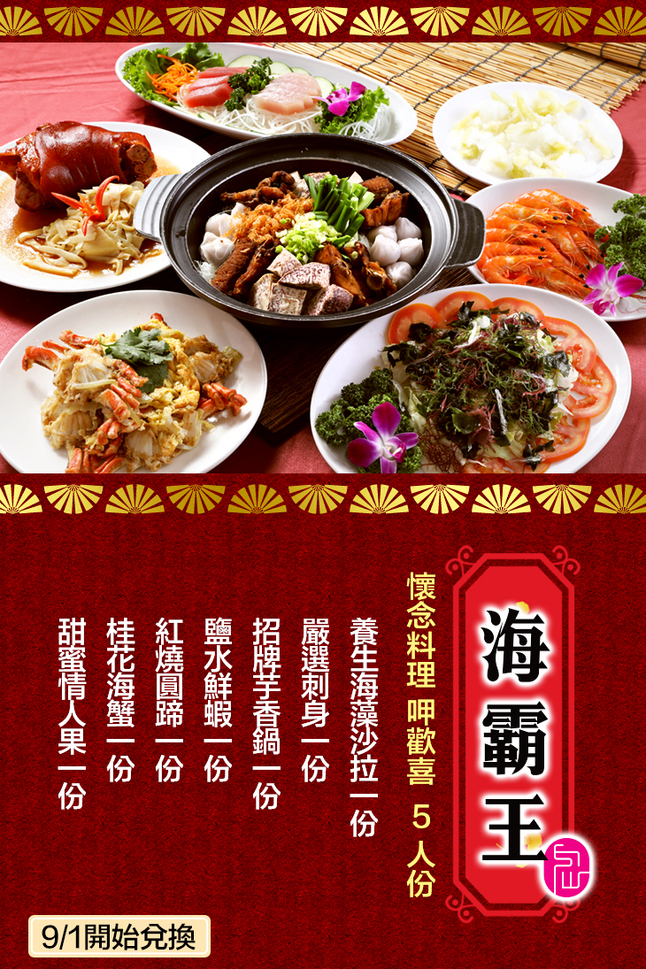 【海霸王】秉持「清」、「鮮」、「份量足」之原則,強調「色、香、味、形」俱備,且不定期到產地嚴格挑選新鮮、美味食材,研發出季節創意料理,以期滿足顧客食的需求!