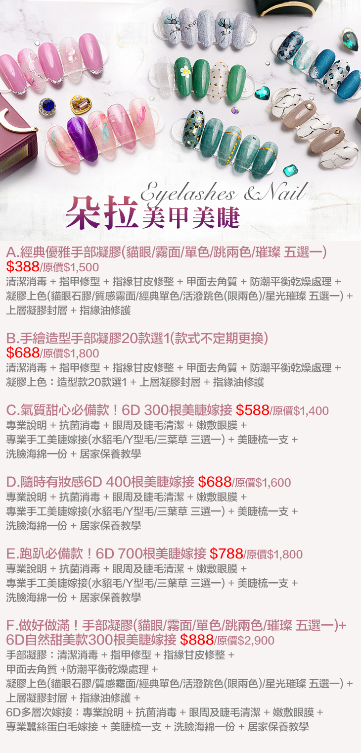 A.經典優雅手部凝膠(貓眼/霧面/單色/跳兩色/璀璨 五選一) / B.手繪造型手部凝膠20款選1(款式不定期更換) / C.氣質甜心必備款!6D 300根美睫嫁接 / D.隨時有妝感6D 400根美睫嫁接 / E.跑趴必備款!6D 700根美睫嫁接 / F.做好做滿!手部凝膠(貓眼/霧面/單色/跳兩色/璀璨 五選一)+6D自然甜美款300根美睫嫁接
