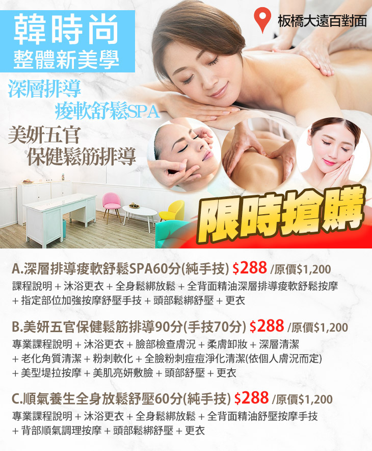 A.深層排導痠軟舒鬆SPA60分(純手技) / B.美妍五官保健鬆筋排導90分(手技70分) / C.順氣養生全身放鬆舒壓60分(純手技)