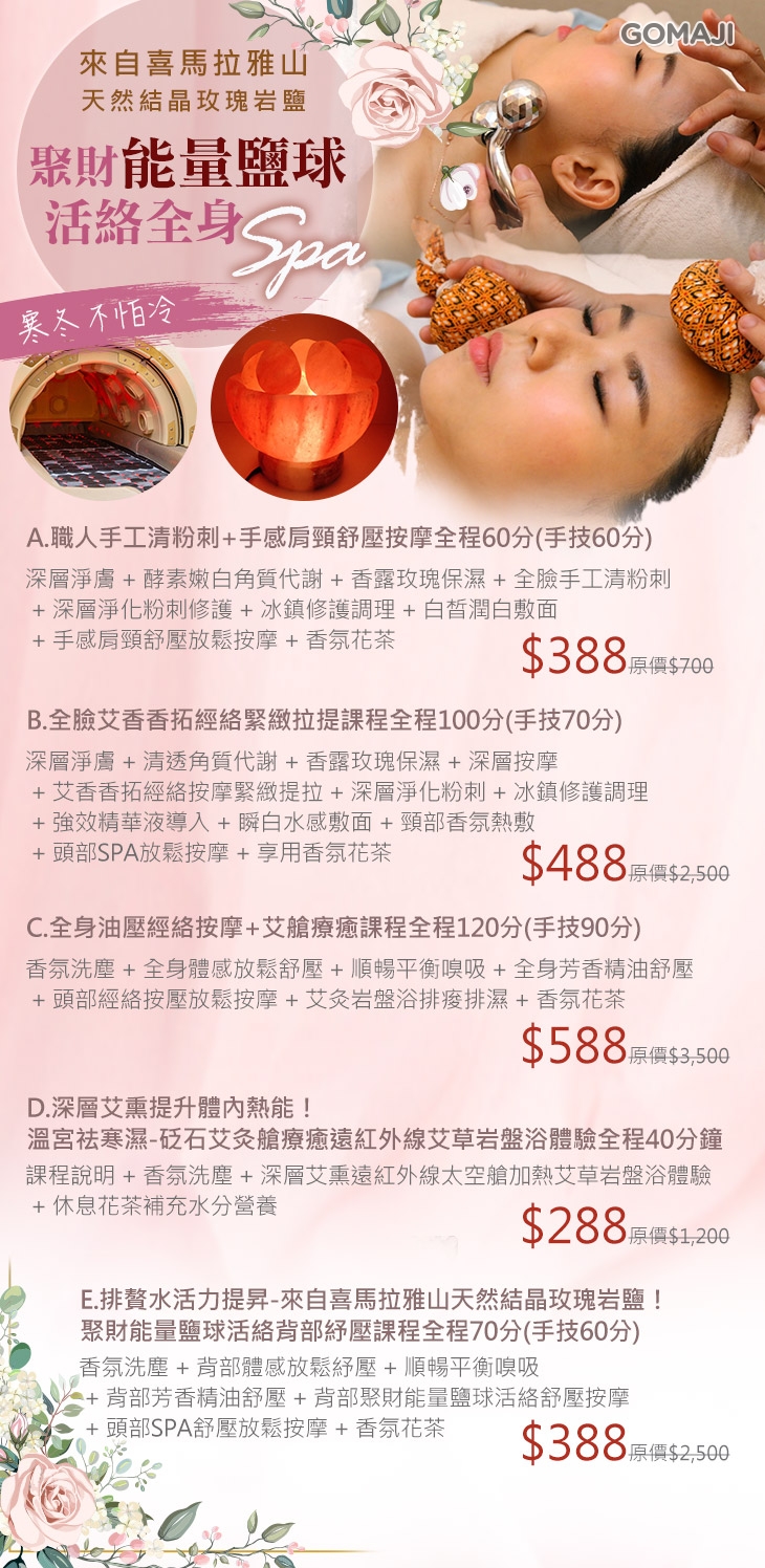 A.職人手工清粉刺+手感肩頸舒壓按摩全程60分(手技60分) / B.全臉艾香香拓經絡緊緻拉提課程全程100分(手技70分) / C.全身油壓經絡按摩+艾艙療癒課程全程120分(手技90分) / D.深層艾熏提升體內熱能!溫宮祛寒濕-砭石艾灸艙療癒遠紅外線艾草岩盤浴體驗全程40分鐘 / E.排贅水活力提昇-來自喜馬拉雅山天然結晶玫瑰岩鹽!聚財能量鹽球活絡背部紓壓課程全程70分(手技60分)