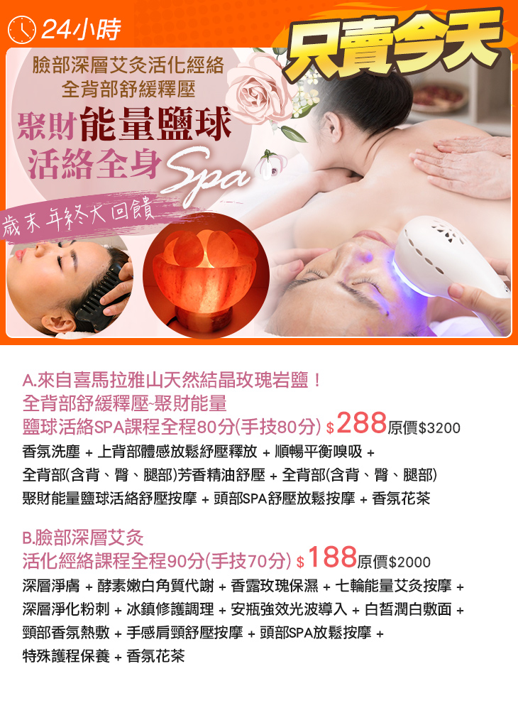 A.來自喜馬拉雅山天然結晶玫瑰岩鹽!全背部舒緩釋壓~聚財能量鹽球活絡SPA課程全程80分(手技80分) / B.臉部深層艾灸活化經絡課程全程90分(手技70分)