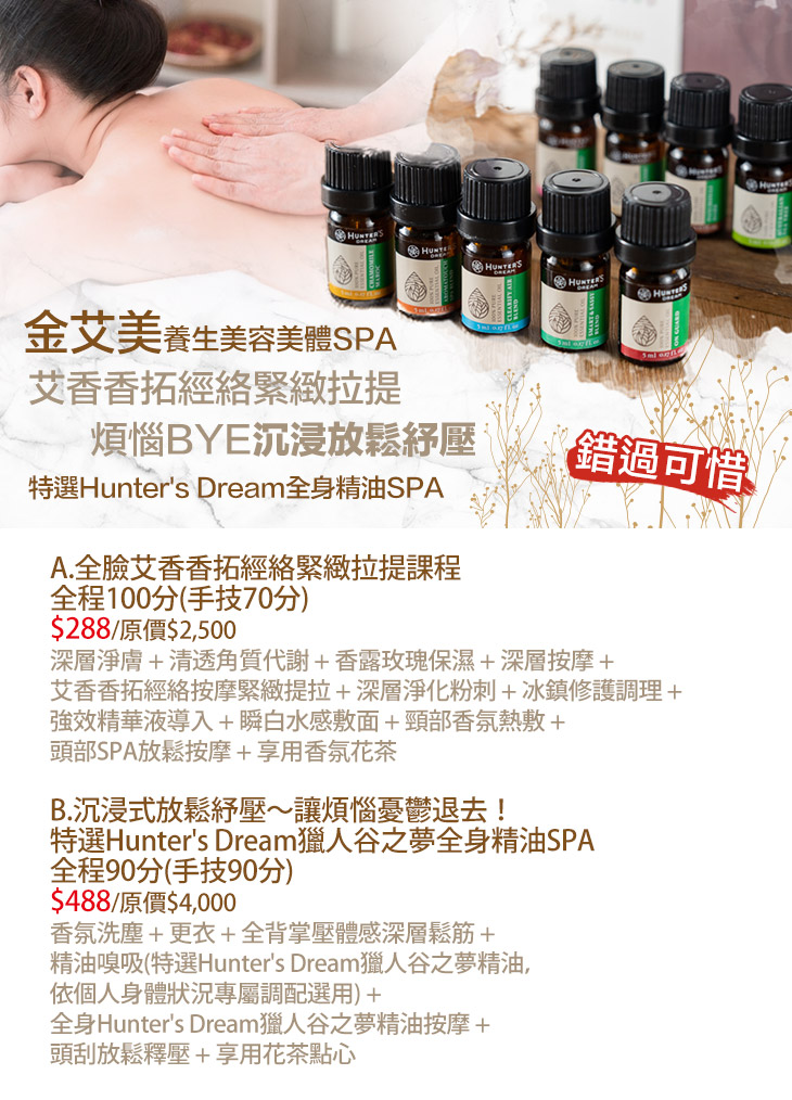 A.全臉艾香香拓經絡緊緻拉提課程全程100分(手技70分) / B.沉浸式放鬆紓壓~讓煩惱憂鬱退去!特選Hunter's Dream獵人谷之夢全身精油SPA全程90分(手技90分)