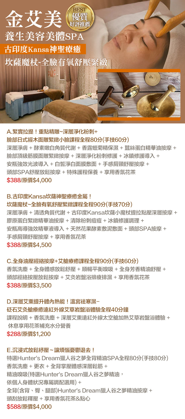 A.緊實拉提!重點精雕~深層淨化粉刺+臉部日式經木面雕緊緻小臉課程全程80分(手技60分)/B.古印度Kansa坎薩神聖療癒金屬!坎薩魔杖~全臉有氧舒壓緊緻課程全程90分(手技70分)/C.全身油壓經絡按摩+艾艙療癒課程全程90分(手技60分)/D.深層艾熏提升體內熱能!溫宮祛寒濕-砭石艾灸艙療癒遠紅外線艾草岩盤浴體驗全程40分鐘/E.沉浸式放鬆紓壓~讓煩惱憂鬱退去!特選Hunter's Dream獵人谷之夢全背精油SPA全程80分(手技80分