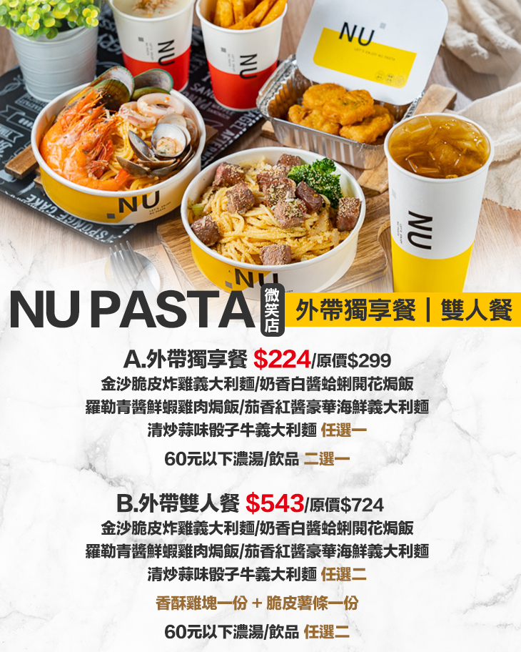 【NU PASTA(微笑店)】為您獻上特製的外帶獨享餐,真材實料的份量,讓您將美味帶著走!在家、在辦公室,都能享用一份經典不敗的義式美味!
