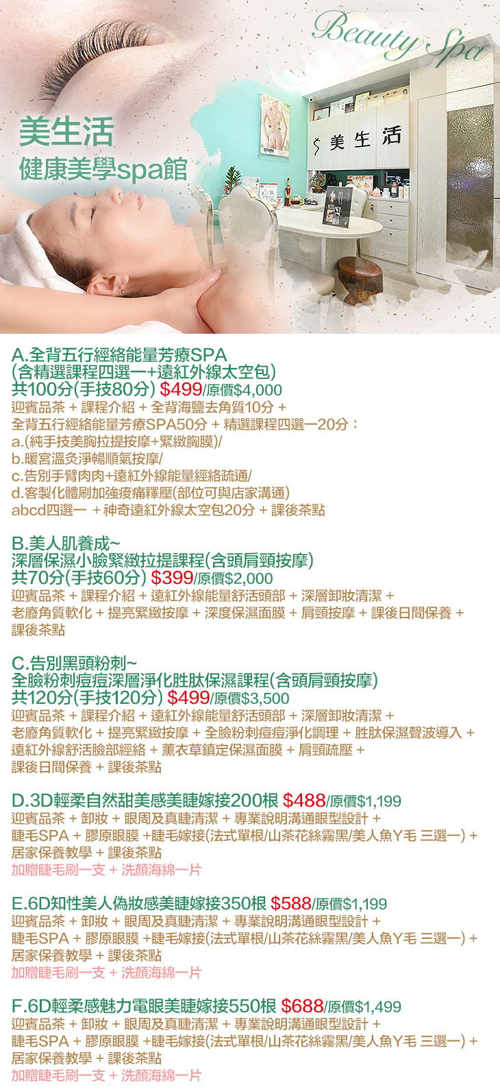A.全背五行經絡能量芳療SPA(含精選課程四選一+遠紅外線太空包)共100分(手技80分) / B.美人肌養成~深層保濕小臉緊緻拉提課程(含頭肩頸按摩)共70分(手技60分) / C.告別黑頭粉刺~全臉粉刺痘痘深層淨化胜肽保濕課程(含頭肩頸按摩)共120分(手技120分) / D.3D輕柔自然甜美感美睫嫁接200根 / E.6D知性美人偽妝感美睫嫁接350根 / F.6D輕柔感魅力電眼美睫嫁接550根