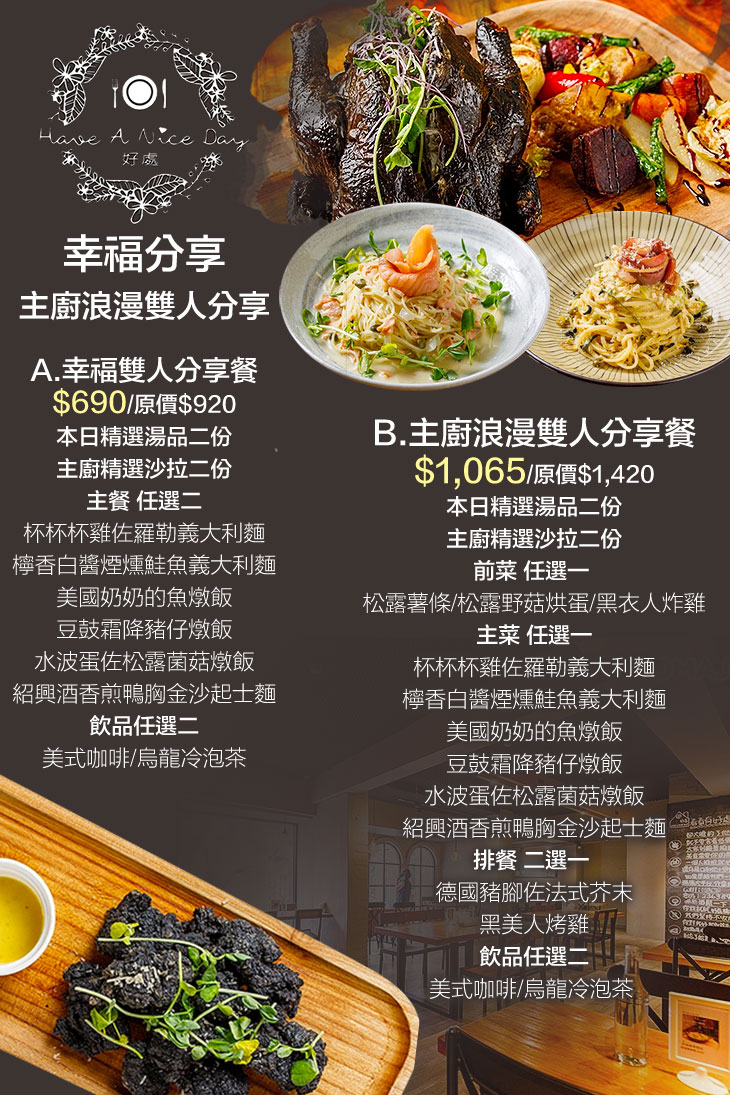您有多久沒有好好停下匆忙的腳步?又有多久沒有回到充滿回憶的地方?「家」,是每個人心中的避風港,【Have A Nice DAY 好處餐廳】要為每一位在都市生活、打拼的朋友,建立一個溫暖的家。在這「家」中,無論是裝潢的營造,亦或是食材的挑選,好處餐廳都堅持要用最好的,就像家人之間毫不保留的愛一般。好處餐廳的餐食,用心運用了台灣在地的食材,結合西式餐食的概念,並以各種富滿巧思的烹飪手法,呈現出一道道很有在地台灣味的創意料理~讓您嘴裡吃得是西餐,味蕾、心靈感受到的,卻是滿滿的家鄉!無論您今天的工作有多繁忙,不妨都先將紛擾放下,一起來好處廚房喝一杯溫暖的熱咖啡、坐下來好好品嚐一桌美食饗宴、好好體會「家」的溫暖。