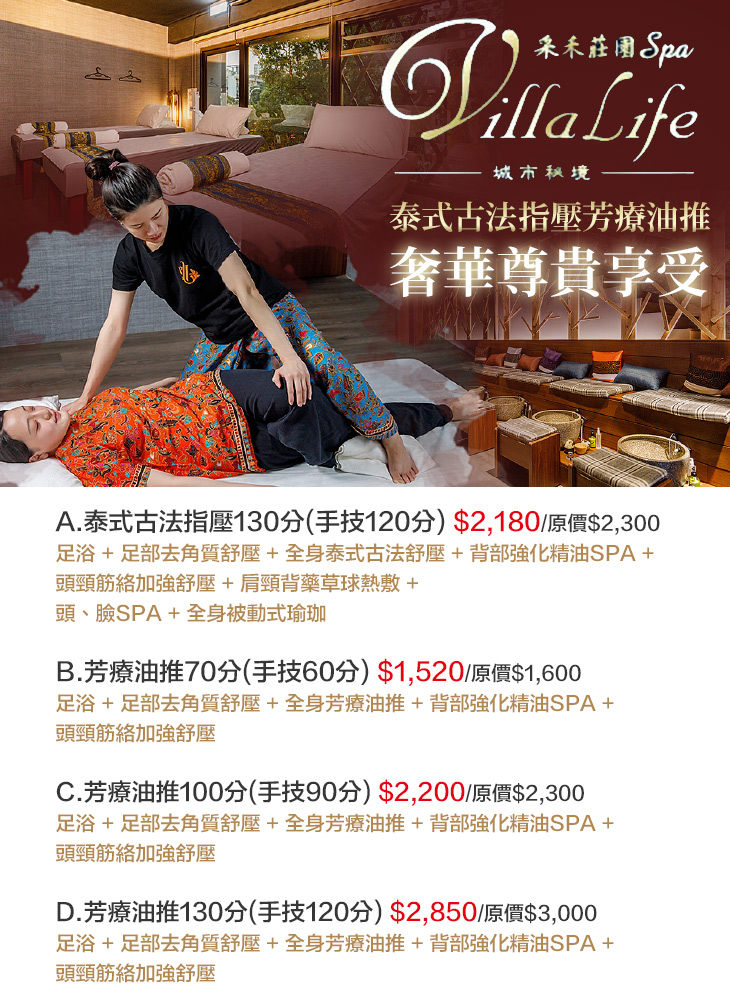 A.泰式古法指壓130分(手技120分) / B.芳療油推70分(手技60分) / C.芳療油推100分(手技90分) / D.芳療油推130分(手技120分)