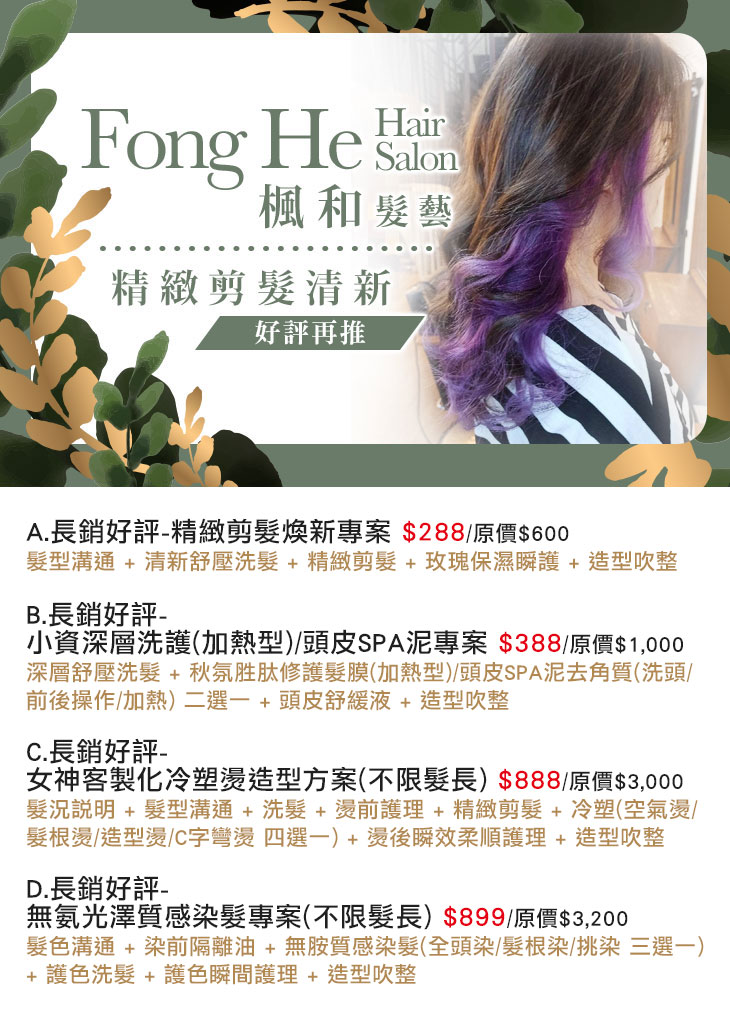 A.長銷好評-精緻剪髮煥新專案 / B.長銷好評-小資深層洗護(加熱型)/頭皮SPA泥專案 / C.長銷好評-女神客製化冷塑燙造型方案(不限髮長) / D.長銷好評-無氨光澤質感染髮專案(不限髮長)