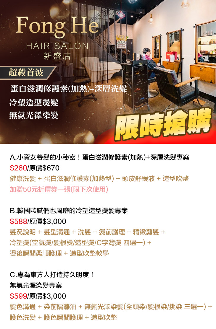 A.小資女養髮的小秘密!蛋白滋潤修護素(加熱)+深層洗髮專案 / B.韓國歐膩們也風靡的冷塑造型燙髮專案 / C.專為東方人打造持久明度!無氨光澤染髮專案