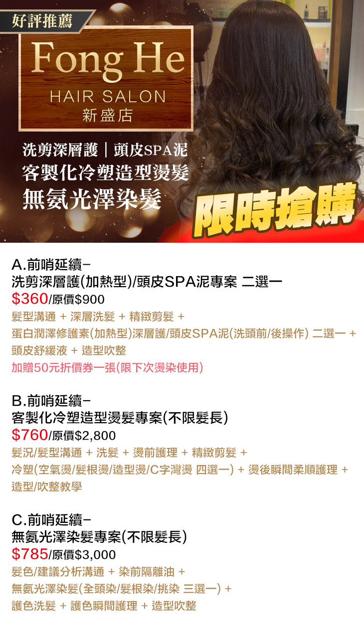 A.前哨延續-洗剪深層護(加熱型)/頭皮SPA泥專案 二選一 / B.前哨延續-客製化冷塑造型燙髮專案(不限髮長) / C.前哨延續-無氨光澤染髮專案(不限髮長)
