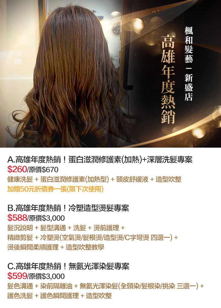 A.高雄年度熱銷!蛋白滋潤修護素(加熱)+深層洗髮專案 / B.高雄年度熱銷!冷塑造型燙髮專案 / C.高雄年度熱銷!無氨光澤染髮專案