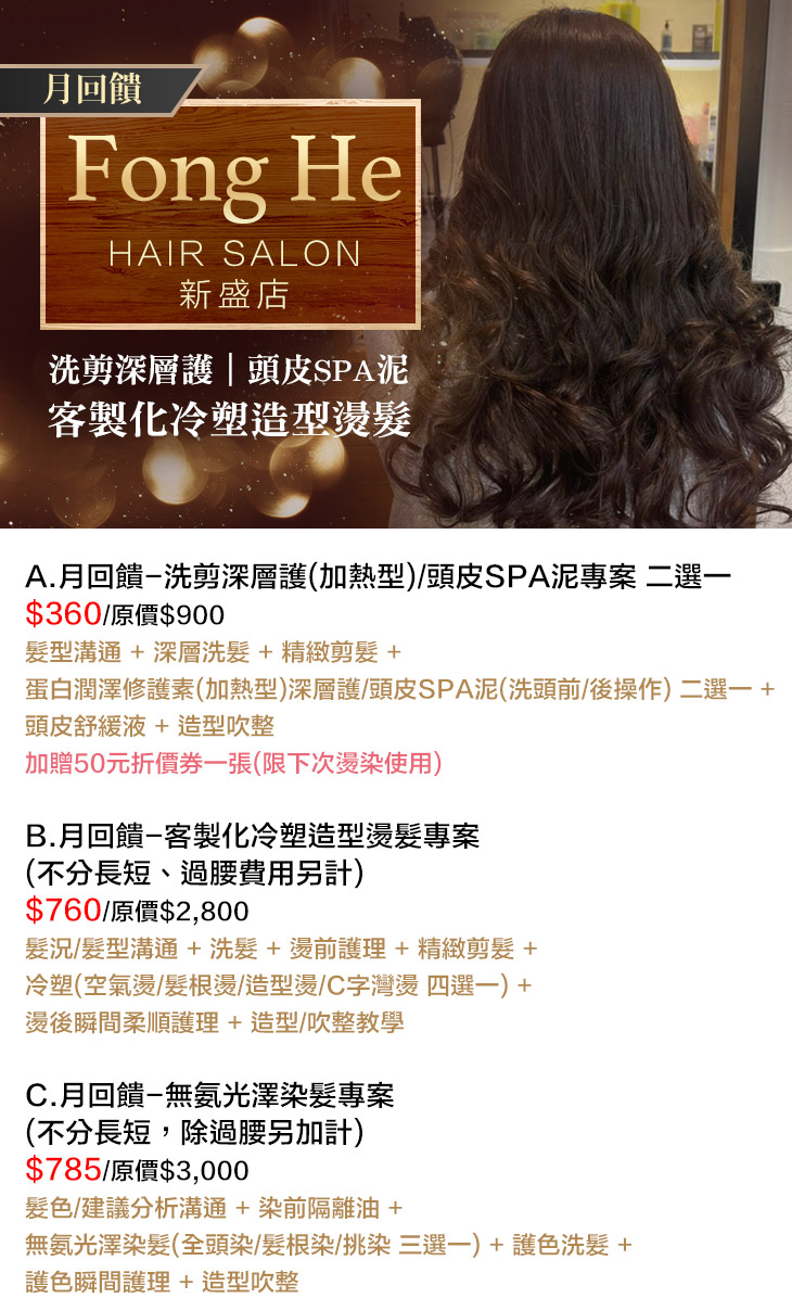 A.月回饋-洗剪深層護(加熱型)/頭皮SPA泥專案 二選一 / B.月回饋-客製化冷塑造型燙髮專案(不分長短,除過腰另加計) / C.月回饋-無氨光澤染髮專案(不分長短,除過腰另加計)