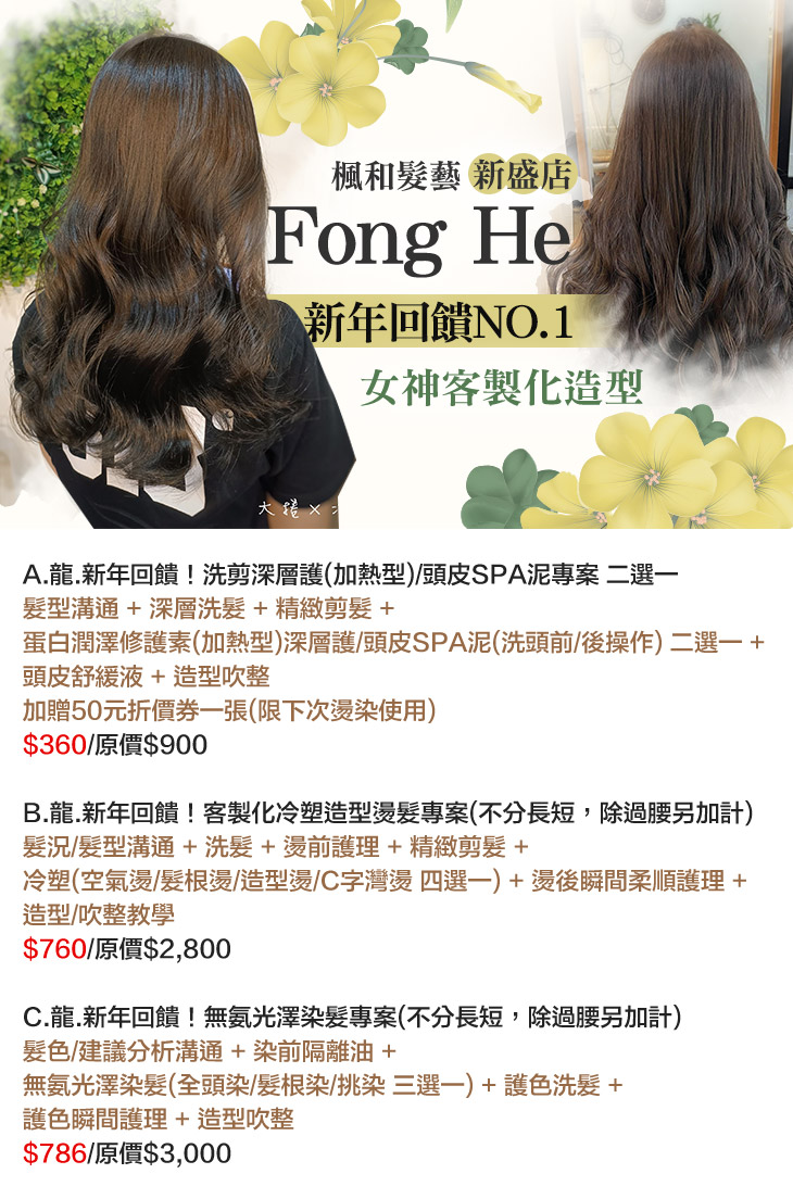 A.龍.新年回饋!洗剪深層護(加熱型)/頭皮SPA泥專案 二選一 / B.龍.新年回饋!客製化冷塑造型燙髮專案(不分長短,除過腰另加計) / C.龍.新年回饋!無氨光澤染髮專案(不分長短,除過腰另加計)