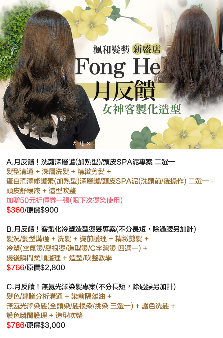 A.月反饋!洗剪深層護(加熱型)/頭皮SPA泥專案 二選一 / B.月反饋!客製化冷塑造型燙髮專案(不分長短,除過腰另加計) / C.月反饋!無氨光澤染髮專案(不分長短,除過腰另加計)