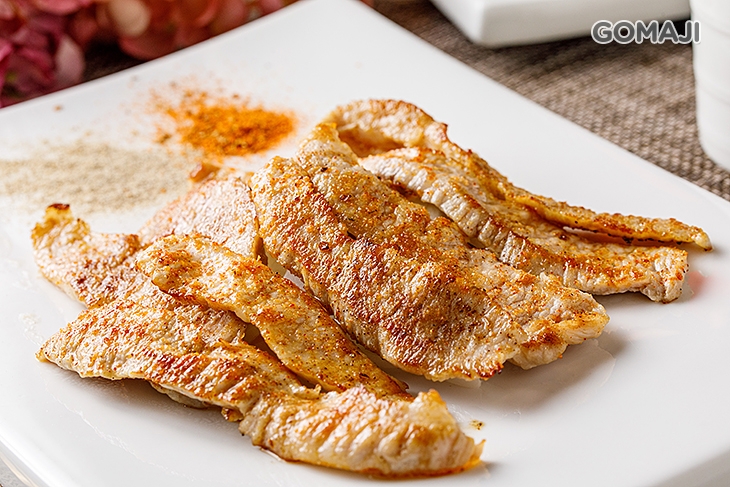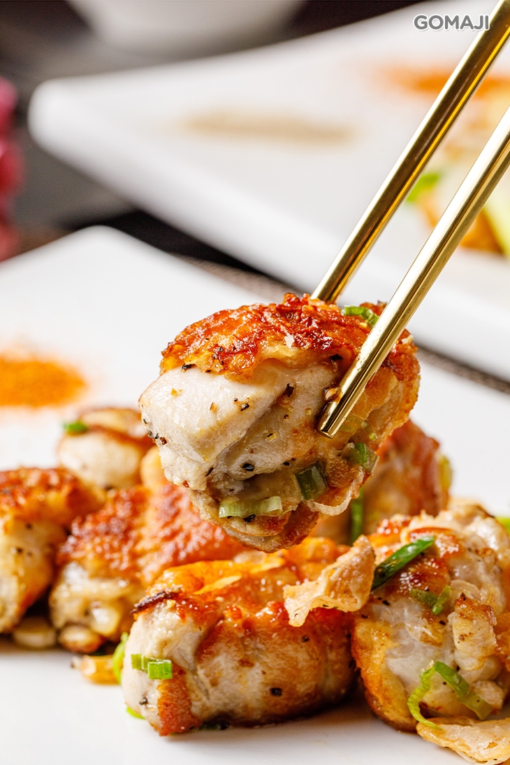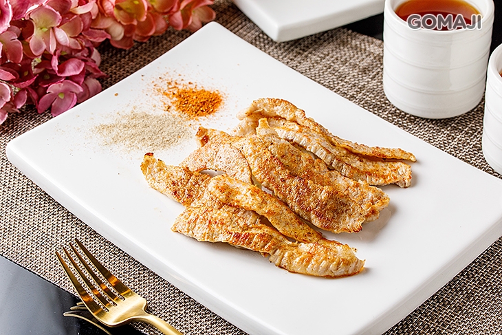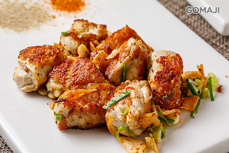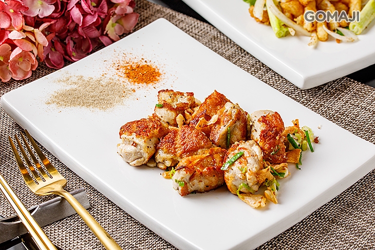 外皮金黃酥脆的無骨雞腿排,肥厚彈牙的肉質,表皮因香煎後,油油脆脆散發迷人香氣!取塊趁熱品嚐,皮香酥肉軟嫩、不乾不柴的滋味,單吃或佐一旁黑胡椒、玫瑰鹽、蒜片品嚐,層次豐富、幸福又滿足啊 ~