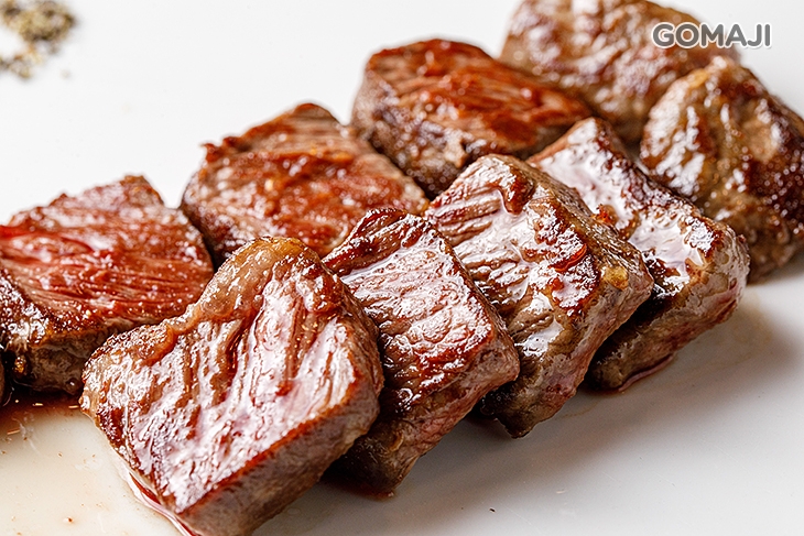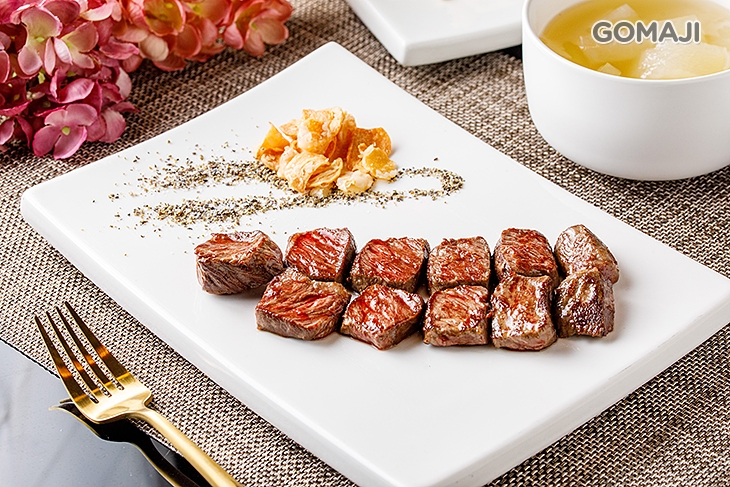 特選美國嫩肩牛,迷人的油花分佈與鮮豔的肉質色澤,平鋪於鐵板上文火香煎,模樣可口啊!主廚以嫻熟的料理手藝,將牛肉軟嫩度掌握得恰恰好!表層油潤光澤,入口極鮮極嫩,單吃品嚐牛肉最天然、最原始的風味,或佐上一旁蒜片提味,奢華享受,人生一定要體驗過一次喔!