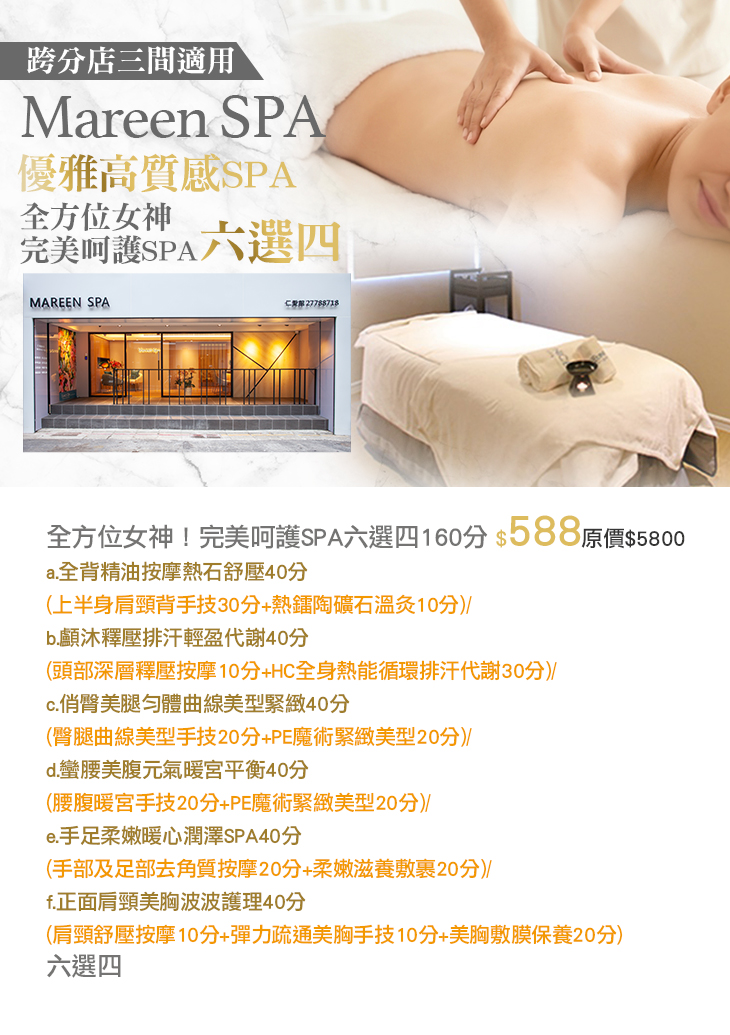 〈a.全背精油按摩熱石舒壓40分/b.顱沐釋壓排汗輕盈代謝40分/c.俏臀美腿勻體曲線美型緊緻40分/d.蠻腰美腹元氣暖宮平衡40分/e.手足柔嫩暖心潤澤SPA40分/f.正面肩頸美胸波波護理40分 六選四〉