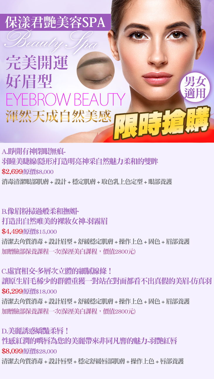 〈清潔去角質消毒 + 設計眉型 + 舒緩穩定肌膚 + 操作上色 + 固色 + 眉部養護〉加贈臉部保養課程一次(保溼美白課程,價值2800元)