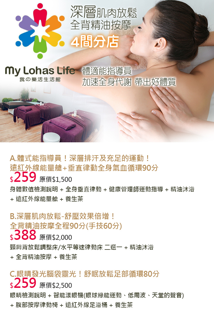 A.體式能指導員!深層排汗及充足的運動!遠紅外線能量艙+垂直律動全身氣血循環90分 / B.深層肌肉放鬆-舒壓效果倍增!全背精油按摩全程90分(手技60分) / C.眼睛發光腦袋靈光!舒眠放鬆足部循環80分
