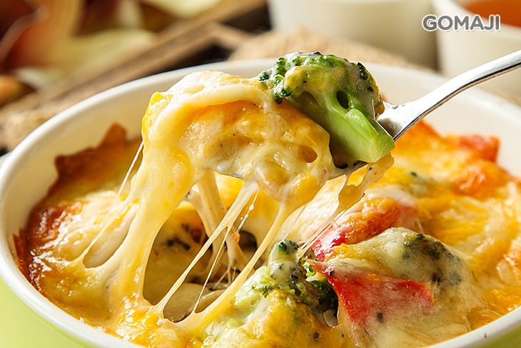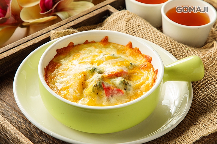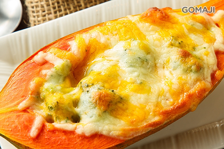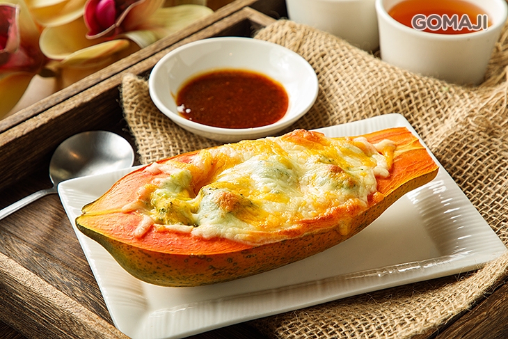 外型像極了台灣的木瓜焗烤,紮紮實實的熟成地瓜,主廚將中間核心的地瓜籽去除,加入時令鮮蔬與金黃乳酪絲入箱文火烘烤,隨著時間分秒過去,乳酪絲散發濃濃的奶香,趁熱品嚐,甜中帶鹹、果肉多汁涮嘴,創意料理,讓第一次嘗試的老饕都深深著迷與愛上。