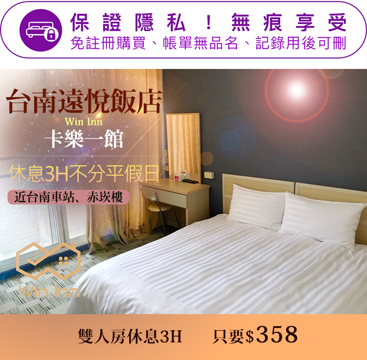 休息3H不分平假日,只要358元!哪裡有這麼好康!?當然是夠麻吉啦!位於台南市中西區新美街上的【台南遠悅飯店卡樂一館】,地點鄰近各大台南知名觀光、特色景點!交通便利,生活機能便捷!針對每間房型的空間規劃與裝潢風格、設計,更別具用心!〝舒適、乾淨〞是最大特點!住宿、休息最佳選擇,非【台南遠悅飯店卡樂一館】莫屬啦!