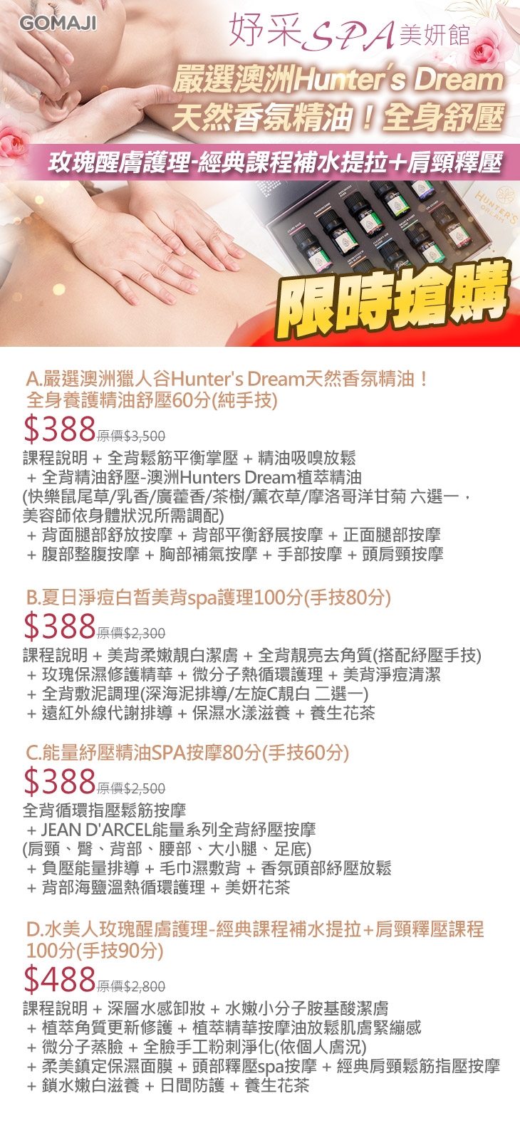 A.嚴選澳洲獵人谷Hunter's Dream天然香氛精油!全身養護精油舒壓60分(純手技) / B.夏日淨痘白皙美背spa護理100分(手技80分) / C.能量紓壓精油SPA按摩80分(手技60分) / D.水美人玫瑰醒膚護理-經典課程補水提拉+肩頸釋壓課程100分(手技90分)