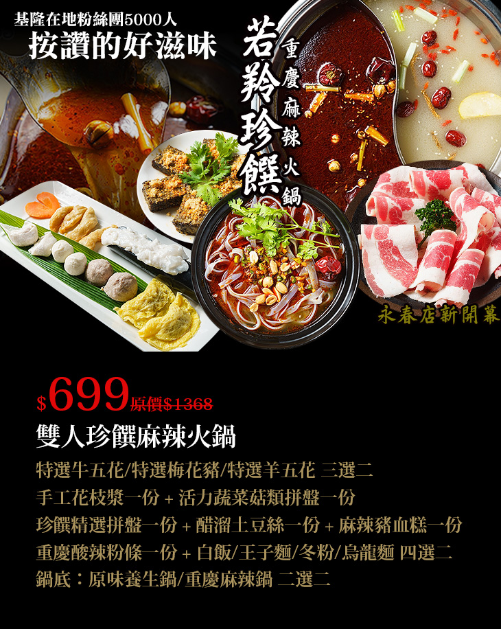 來自基隆,在地人激推的麻辣火鍋名店──【若羚珍饌重慶麻辣火鍋】,現在想一嚐它的美味,不用再遠赴基隆,因為台北永春也吃得到!