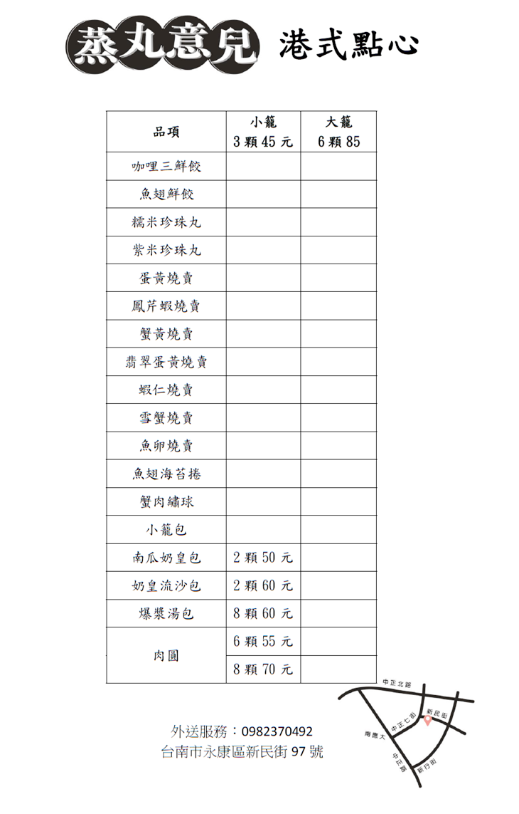 近台南應用科技大學,深受許多當地大學生、上班族喜愛。專賣美味港式點心的「蒸丸意兒港式點心」,堅持全手工製作,用靈巧的雙手、用心的溫度,捏製出美味的形狀!食材皆經過嚴格挑選,由知名飲茶店師傅精心研發,品質與口感絕對有保障~內用位置在於攤車後方的披薩店裡,讓今天就想坐著吃的您,不用擔心外帶美食冷掉、還能揪好友一起聊天吃好料!