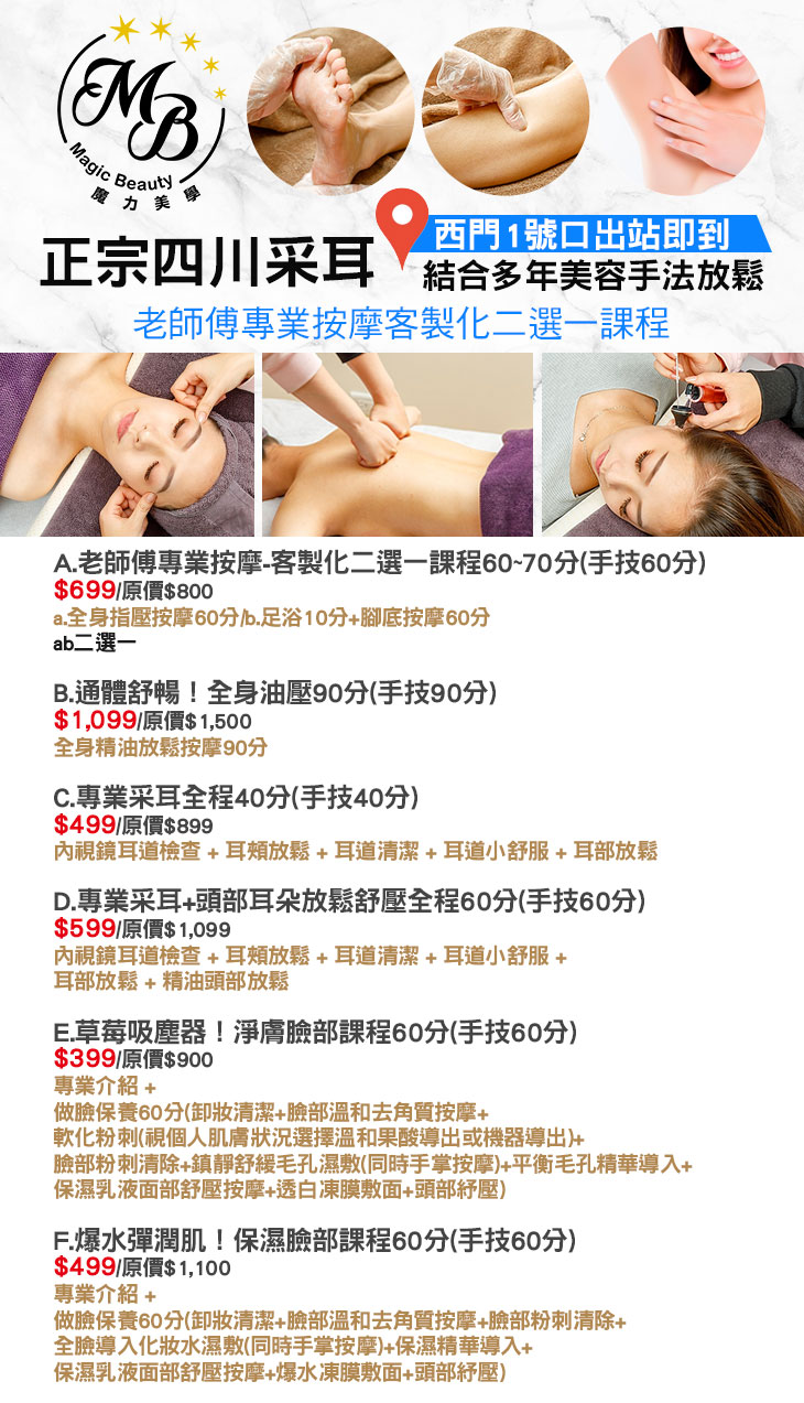 采耳、足體舒壓、美容,多元享受一次給您!引領新潮流的魔力美學Magic Beauty/按摩采耳專門店,打造出鬧中取靜的環境,質感簡約的室內風格、豐富的服務,讓您在一個地方,便能解決所有的需求!專業的美容師、采耳師,皆擁有深厚精湛的手藝,帶著滿滿服務熱忱,為您細心進行課程。生活再忙,也不要忘了好好愛護自己,就讓魔力美學Magic Beauty/按摩采耳專門店成為您繁忙生活中最好的夥伴,在您最需要的時刻,為您撫慰身心靈的健康、維持最重要的美麗。